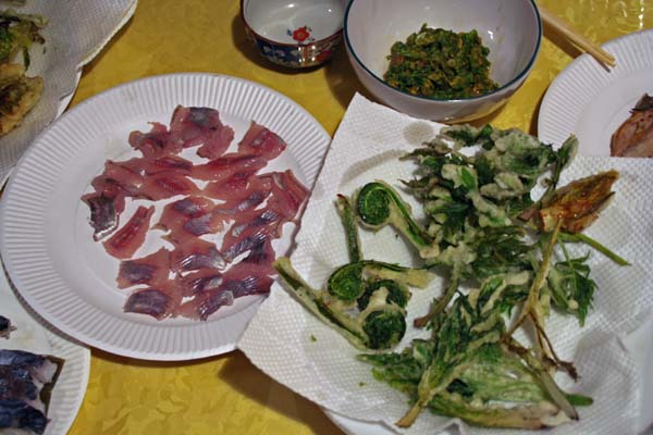 夜はイワナの刺身とフキ珍味(フキノトウを刻んで炒めたものを味噌などであえた物)、山菜の天ぷらを肴に酒盛り。山の幸に乾杯です。