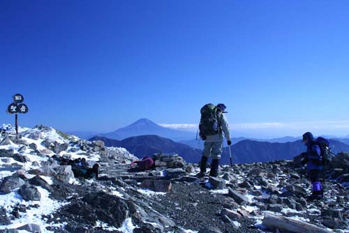 最後の急登に入っても、この状況はまったく変わらず、汗をかきかき牛歩で登った。テン場を出て3時間弱、頂上を踏んだ。そこは、まさに360度の大パノラマ、遮るものは何一つない。ちぎれた雲辺ひとつないのだ。すべてが、ブルーに染まっている。「この時季に、こんなことってあるんだ」と、心の底から底から嬉しさが込みあげてきた。奇跡に近い好天を与えてくれた山の神に感謝!である。