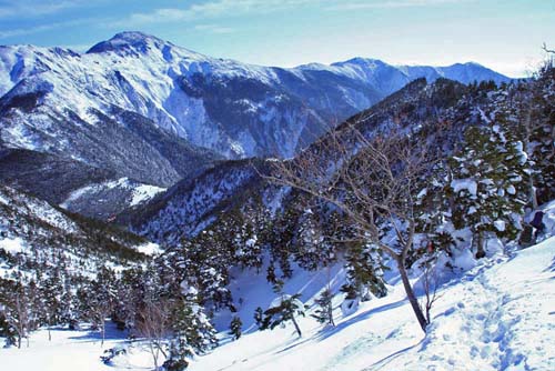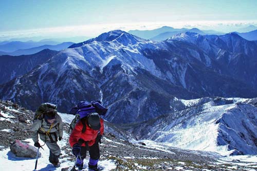 【30日(曇のち雪)】ここからは急登の樹林帯をひたすら登るのみ。「きょうは調子がいい」と高度をどんどん稼いでいたのだが、1700㍍を越えたぐらいから突然、高度障害が出てしまった。呼吸を速めてもさっぱり空気を吸っている気がしないし、足に力も入らない。朝、出るときは、九州から太平洋側を進んでくる低気圧の影響を考えて、時間が許せば、きょうのうちに登頂してしまおうと打ち合わせていたのだが…。
