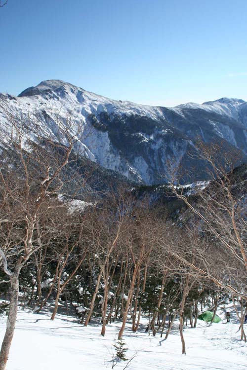 テントを撤収し、再び下りだすが、昨日のトレースは、ほとんど消えている。それほどの降雪はなかったはずだが…。夏道は確か尾根上にあったが、積雪で歩行困難なので、往路と同じ聖平側のすぐ下の樹林帯部分を進む。登りよりも、もぐりかたは少ないが、それでも油断すると腰まで雪にはまりこんでしまうので気は抜けない。