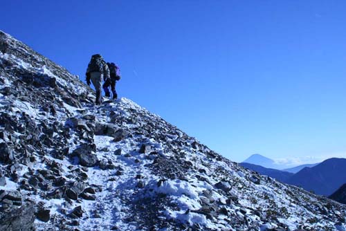 しばらく行くと、娘と両親のファミリーパーティーと出会う。父親が地形図片手にビバーグ適地を探していたので、我々がビバーグしたところを推薦した。「あと1時間かな」と教えると、顔を赤く上気させた娘さんが「もう動けない」と叫ぶ。ちょうど出会ったところが、少し平になっていたので「ここでいい」と主張している。父親は、「そんな上に風が当たらないところがあるのか」と半信半疑、母親は無言で夫の決断を待っている。父親は地形図とにらめっこして、なかなか結論を出せないでいる。まあ、これ以上は余計なお節介になるので、「明日のことを考えれば、少しでも上の方がいいですよ」と娘さんに声をかけ、別れを告げた。