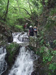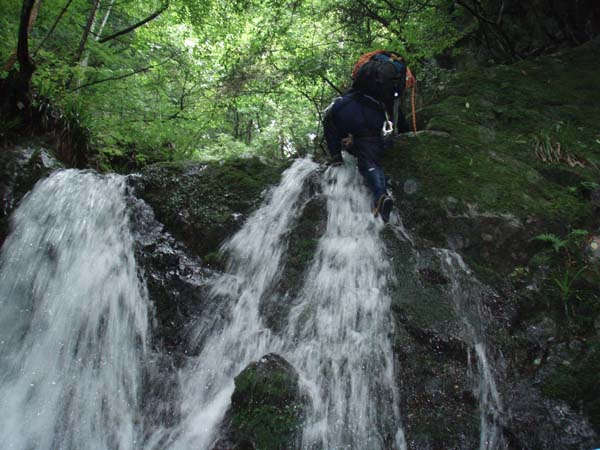 5mナメ滝を力で直登するテンプル
